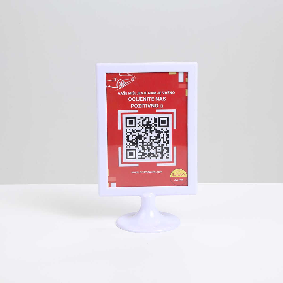 Promo stalak je samostojeći PVC stalak dizajniran za jednostavno i učinkovito prikazivanje informacija. Ovaj stalak dolazi s izmjenjivim umetkom, što omogućava brzu promjenu sadržaja prema potrebama promocije ili događaja. Izrađen od čvrstog PVC materijala, pruža stabilnost i dugotrajnost, dok njegova kompaktna veličina čini ga idealnim za razne prostore, poput trgovina, kafića ili izložbenih štandova. Svojim jednostavnim i elegantnim dizajnom, promo stalak A5 pomaže u isticanju vaših poruka na profesionalan način.